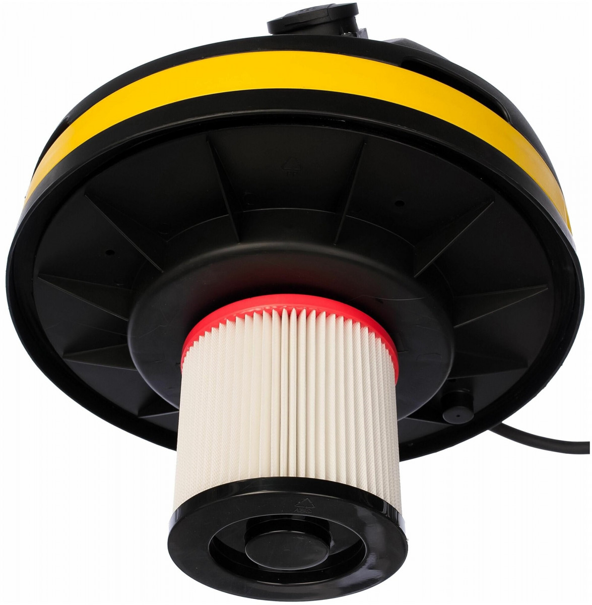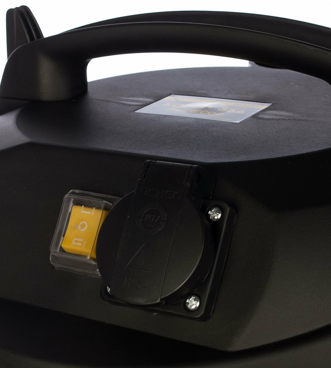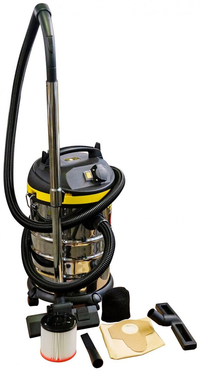 Бак для сбора мусора имеет объем 30 литров и изготовлен из нержавеющей стали. Такая конструкция позволяет работать с различными жидкостями, влажными отходами, твердыми и крупными кусками мусора без ущерба для агрегата. В верхней части пылесоса находится дополнительная розетка, к которой можно подключать электроприборы с диапазоном мощностей от 100 до 2000 Вт. Благодаря такому решению запуск пылесоса можно синхронизировать со стартом основного агрегата. Для удобства транспортировки пылесос снабжен колесами, обеспечивающими максимальную легкость передвижения. Преимущества: