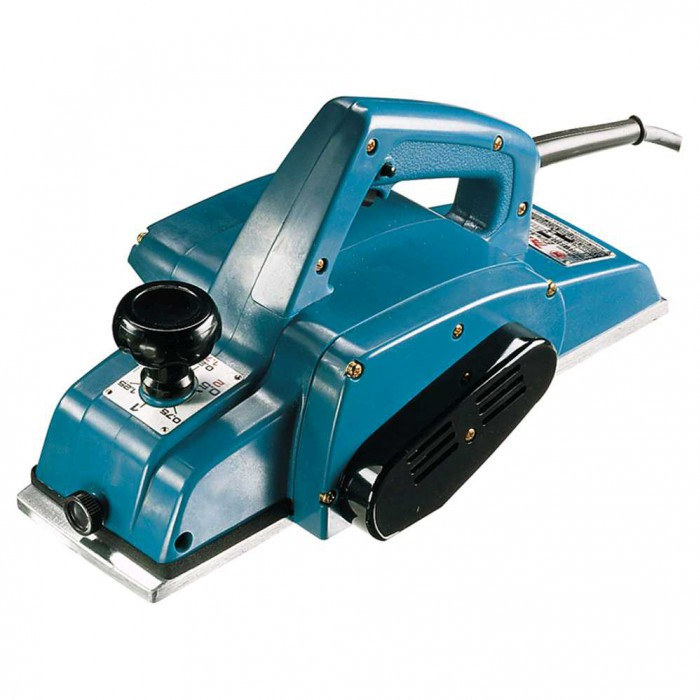 Инструмент оснащен твердосплавным ножом шириной 110 миллиметров. Благодаря этому им можно обрабатывать широкие доски и детали. Рубанок защищен от перегрева – электродвигатель охлаждается за счет воздуха; он поступает через отверстия в корпусе.
