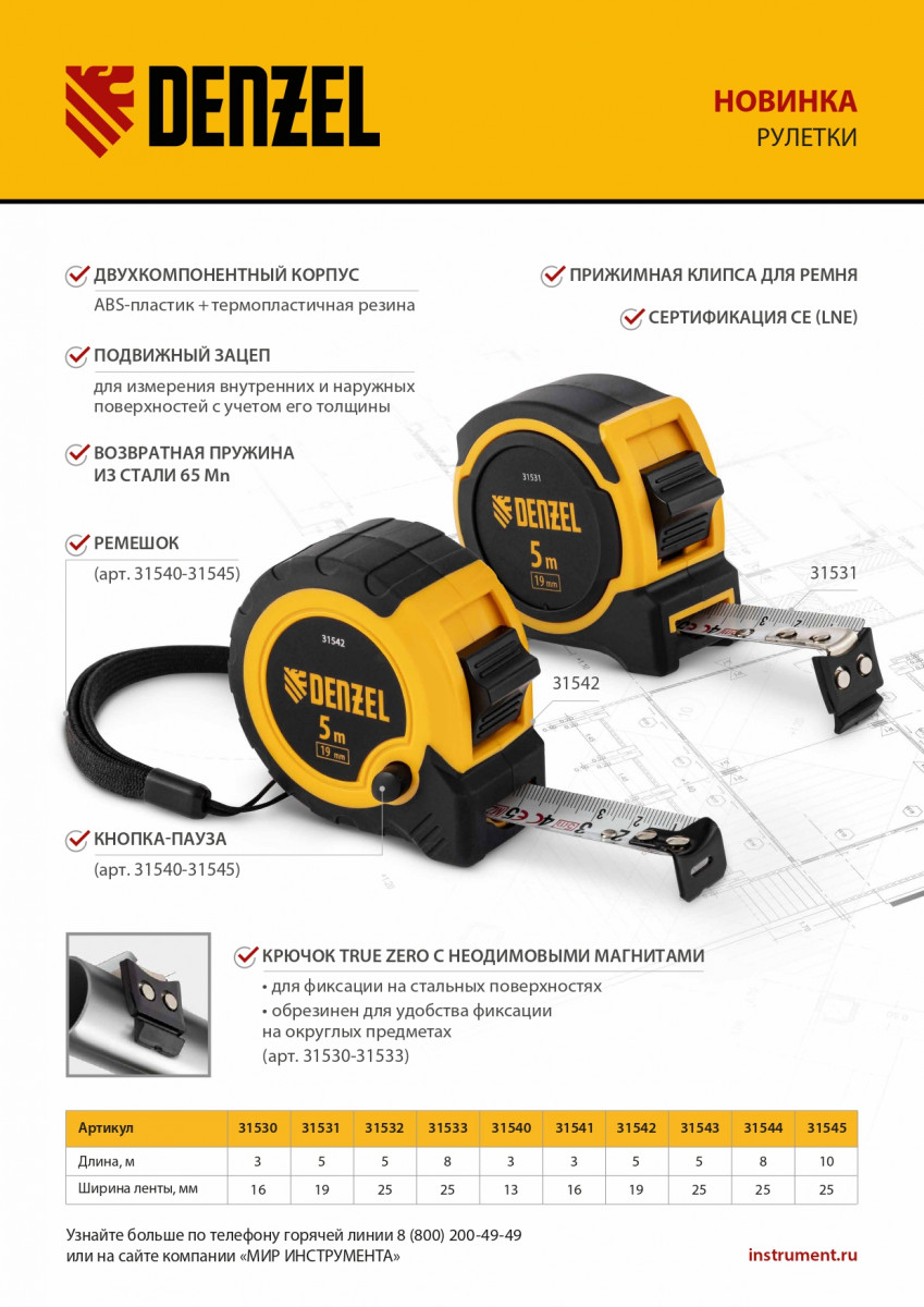 Рулетка Denzel 31543 в двухкомпонентном корпусе, с кнопкой-паузой, с полотном шириной 25 мм и длиной 5 м, используется для измерения расстояний и размеров предметов. Удобна для работы в труднодоступных местах. Стальная лента с эмалевым покрытием и защитной пластиной в месте крепления зацепа рассчитана на долгий срок службы. Рулетка будет полезна во время строительства и ремонта, а также пригодится в быту.