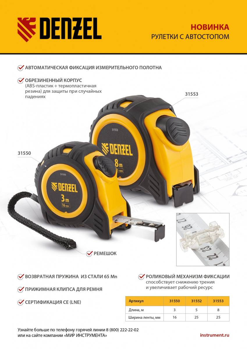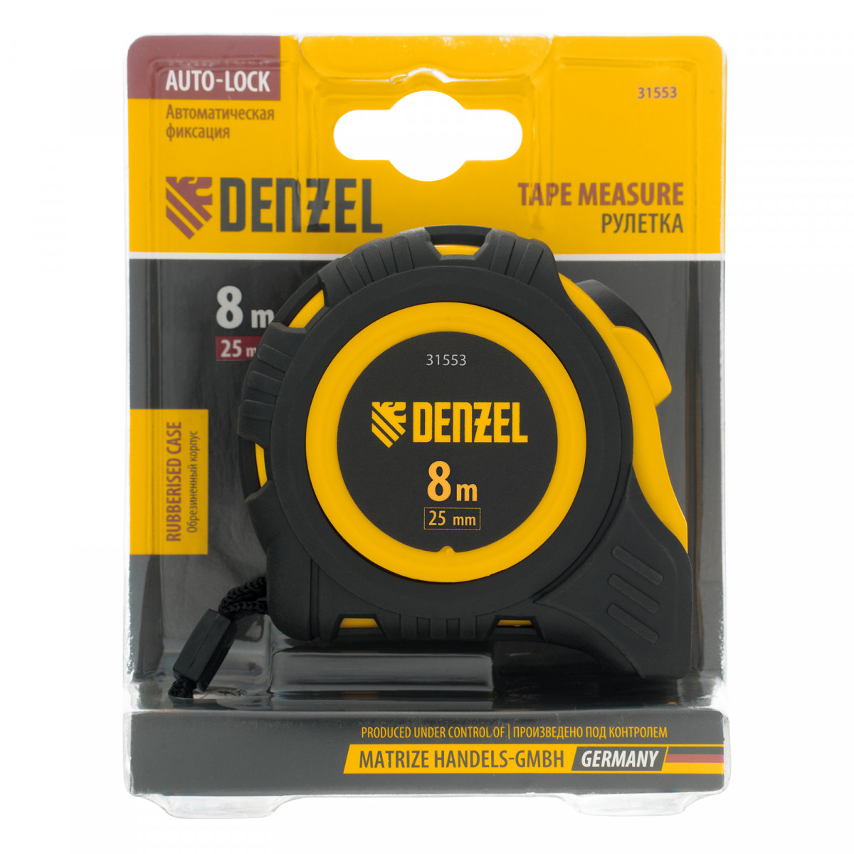 Рулетка 8м х 25мм, обрезиненный корпус, автоматическая фиксация Denzel