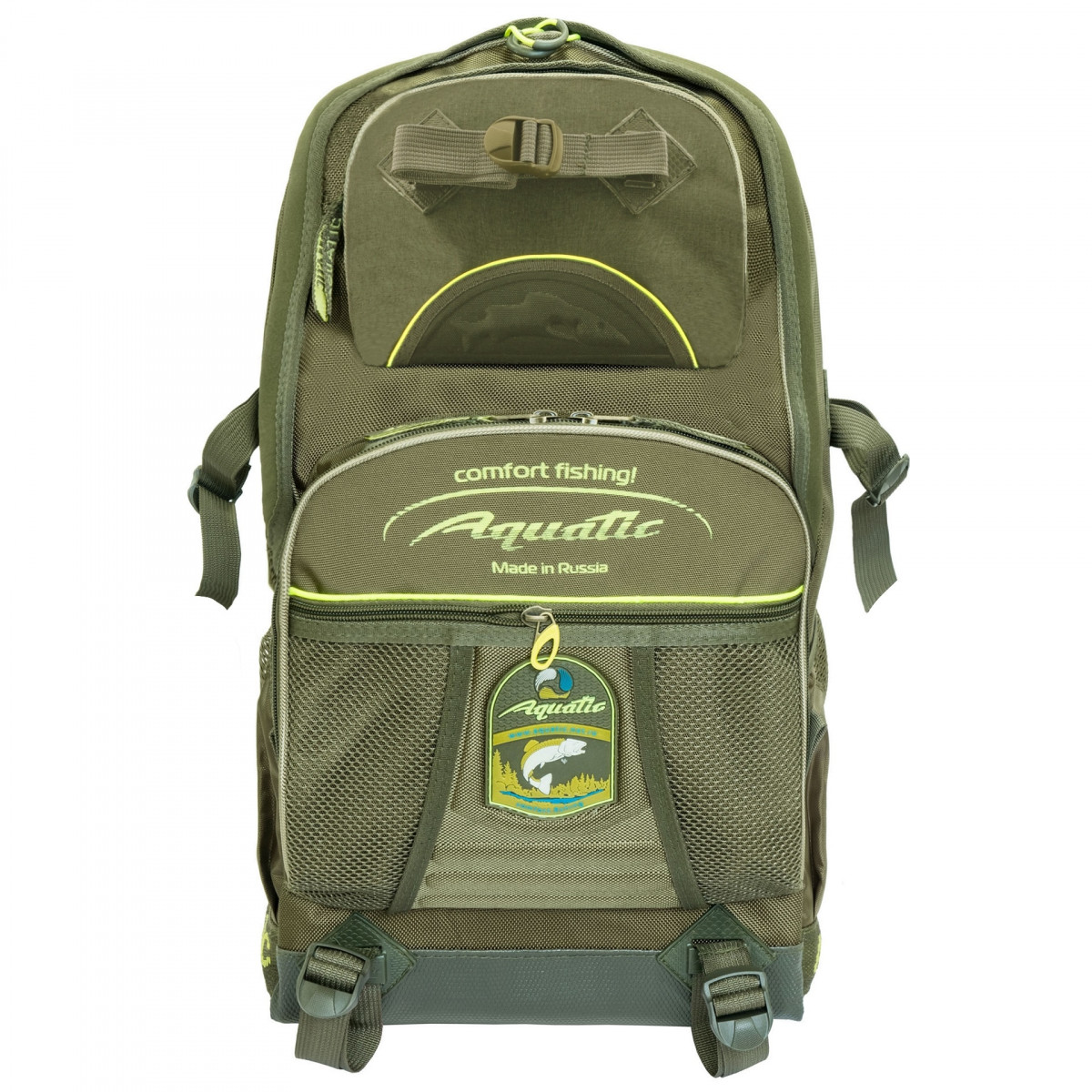 Самый популярный у рыбаков рюкзак Aquatic объёмом 40 литров изготавливается из качественных непромокаемых материалов. Состоит из основного отделения, защищенного от влаги неопреновой лентой, и 5 наружных карманов разной функциональности. На рюкзаке возможно закрепить габаритные вещи: тубус, туристический коврик, теплые вещи и прочее. Рюкзак имеет грудную регулировку и уплотненную спинку.