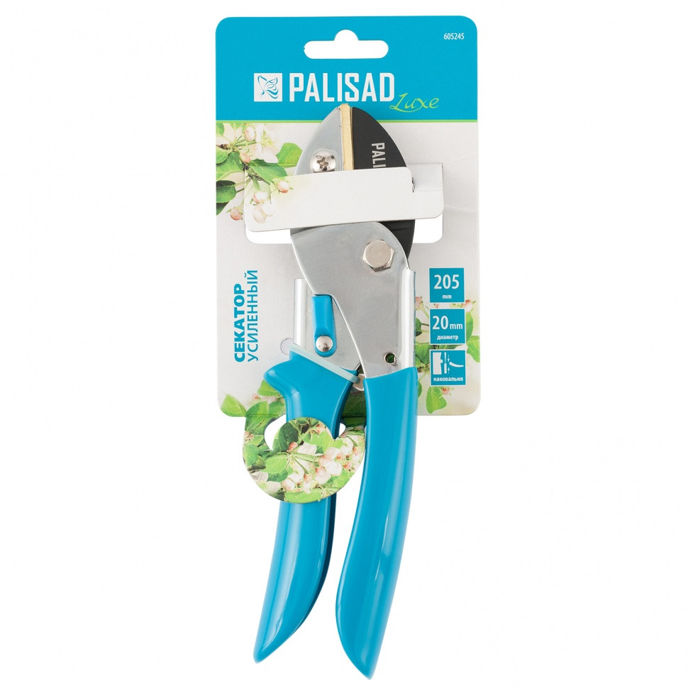 Усиленный секатор Palisad LUXE 605245 длиной 205 мм, с наковальней и рукоятками в ПВХ-оболочке, предназначен для обрезки сухих и увядших веток толщиной до 20 мм, в том числе для срезания засохшей виноградной лозы. Опорная пластина удерживает ветку, облегчая работу. Рычажный механизм увеличивает усилие сжатия на 10%.