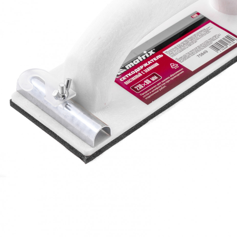 Пластиковый сеткодержатель Matrix 75849 с подошвой 230 х 80 мм, с зажимами, используется для ручного шлифования деревянных, шпатлеванных, металлических, пластмассовых и прочих твердых поверхностей. Сеткодержатель фиксирует абразивную стеклосетку или шлифлист и позволяет удалять старые отделочные покрытия, подготавливать поверхность под покраску, а также выполнять чистовую обработку.