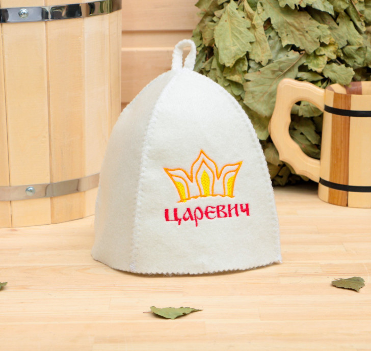 Шапка для бани с детской вышивкой Царевич белая войлок