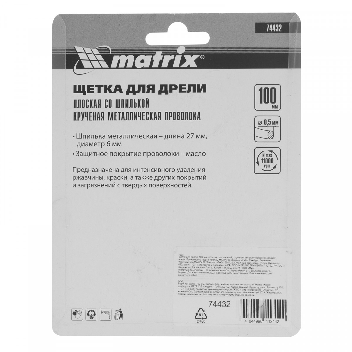 Плоская щетка со шпилькой для дрели Matrix 74432 диаметром 100 мм, с щетиной из крученой металлической проволоки, позволяет быстро очистить металлическую, деревянную или бетонную поверхность от загрязнений, ржавчины, старой краски или лака. Используется для обработки внутренних углов, пазов, изгибов, узких и труднодоступных мест. Подходит для очистки сварных швов. При помощи хвостовика диаметром 6 мм щетку устанавливают в патрон дрели или ПШМ с максимальной частотой вращения до 11000 об/мин. Насадка применяется в строительстве, машиностроении, пригодится также в быту. Во время работы со щеткой следует использовать средства индивидуальной защиты.