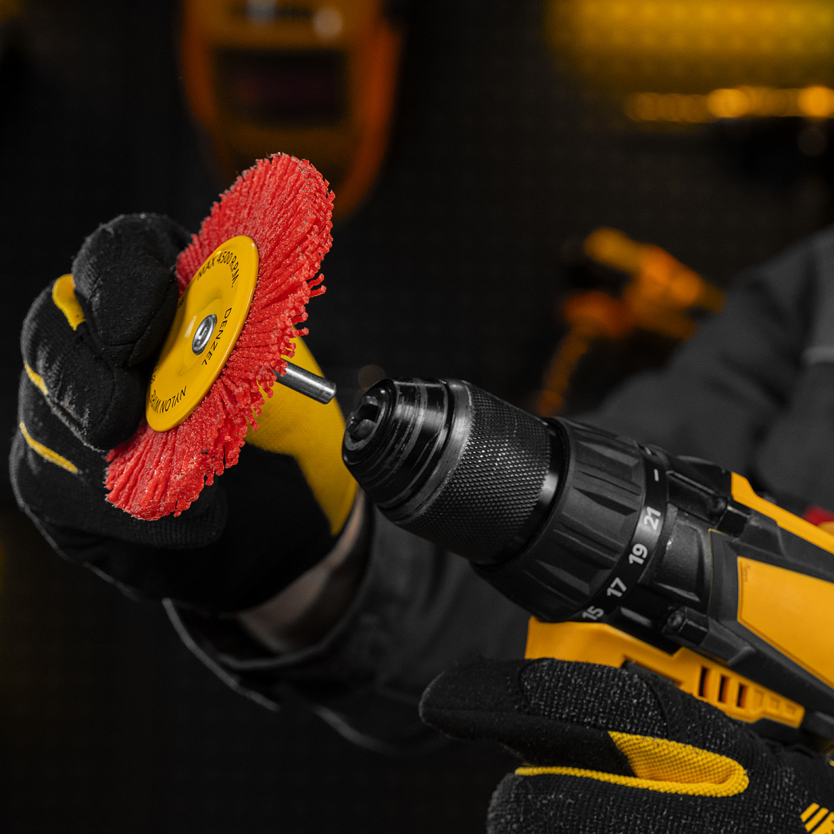 Плоская щетка Denzel 74434 диаметром 100 мм, со шпилькой и нейлоновой щетиной, — насадка для дрели, предназначенная для выполнения шлифовальных работ по пластику, древесине, стали и цветным металлам. Щетина изготовлена из высококачественного нейлона с нанесенным абразивом из оксида алюминия. Щетка оптимальна для деликатного удаления загрязнений, краски, пятен ржавчины с твердых поверхностей. Позволяет придать шероховатость поверхности, подходит для браширования древесины. Благодаря плоской форме насадка удобна для обработки пазов, изгибов и угловых соединений.