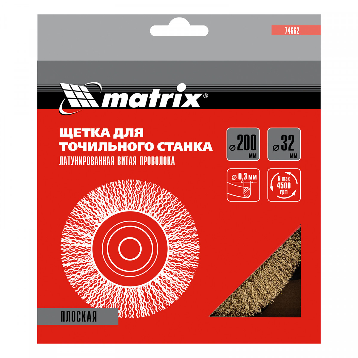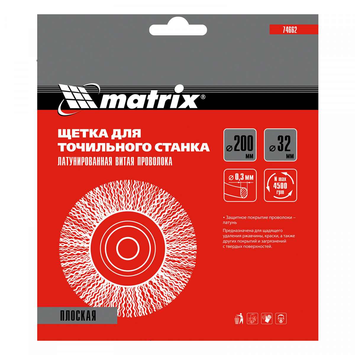 Плоская щетка Matrix 74662 диаметром 200 мм, с щетиной из латунированной витой проволоки, устанавливается на точило с посадочным размером 32 мм. Рекомендуемая скорость вращения — не более 4500 об/мин. Витая проволока позволяет в щадящем режиме зачистить тонкий слой ржавчины и лакокрасочных покрытий, удалить различные загрязнения с небольших или хрупких деталей. Благодаря плоской форме щетка подходит для обработки труднодоступных мест.