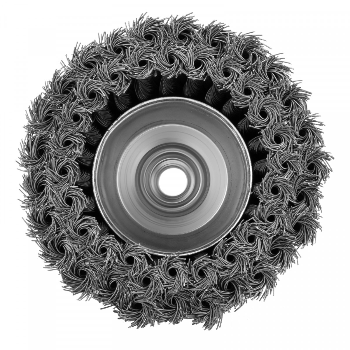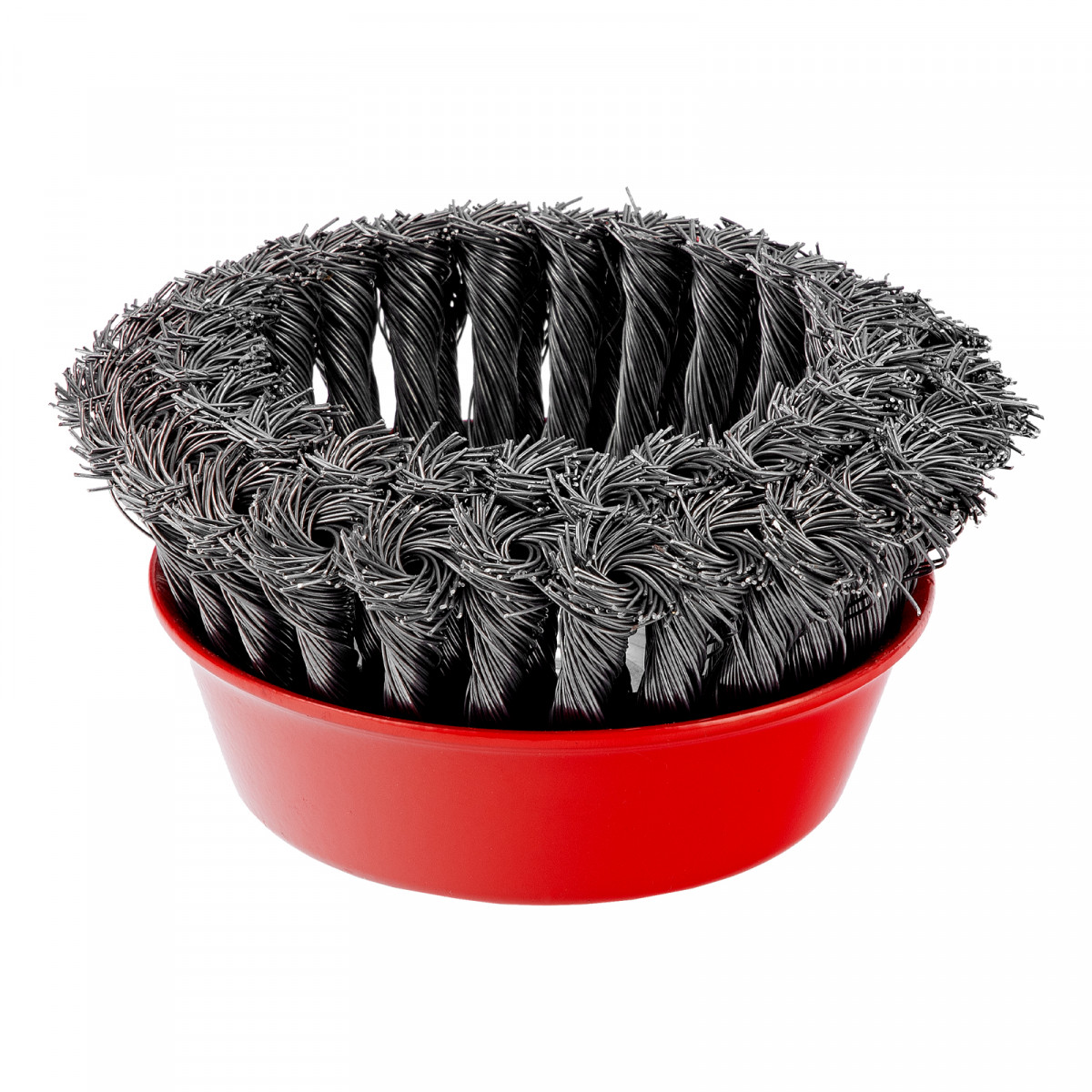Двухрядная щетка Matrix «Чашка» 74683 диаметром 125 мм, с щетиной из крученой проволоки толщиной 0,5 мм, устанавливается на вал углошлифовальной машины с помощью гайки М14. Рекомендованная максимальная скорость вращения — до 6500 об/мин. Оснастка оптимальна для грубой (черновой) обработки: снятия старого слоя лакокрасочного покрытия и ржавчины, удаления загрязнений, зачистки сварных швов. Эффективно справляется с зачисткой больших поверхностей, подходит для выполнения работ повышенной сложности.
