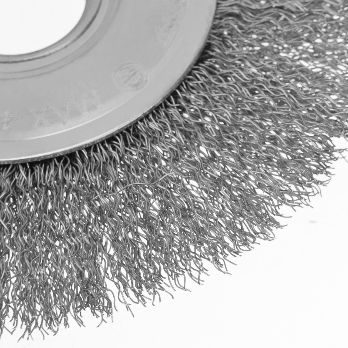 Щетка для УШМ, 125 мм, "Плоская", витая нержавеющая проволока 0.3 мм, посадка 22.2 мм Denzel