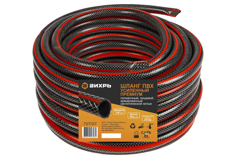 Шланг Вихрь 73/7/2/7 поливочный усиленный, премиум качества предназначен для полива земельных участков, газона и других подобных поверхностей. Шланг выполнен из высококачественного ПВХ-материала, армированного трёхслойной нейлоновой нитью. Данная модель шланга является лучшей в своём классе. Выдерживает давление до 25 бар.