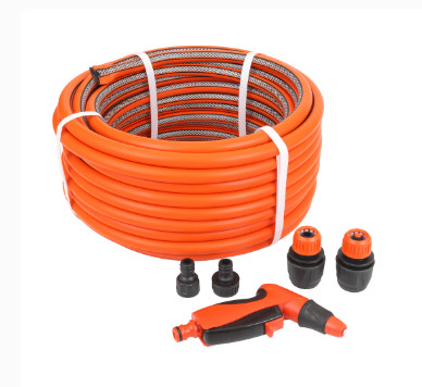 Набор для полива включает в себя поливочный шланг и комплектующие, необходимые для его быстрого подключения и использования: