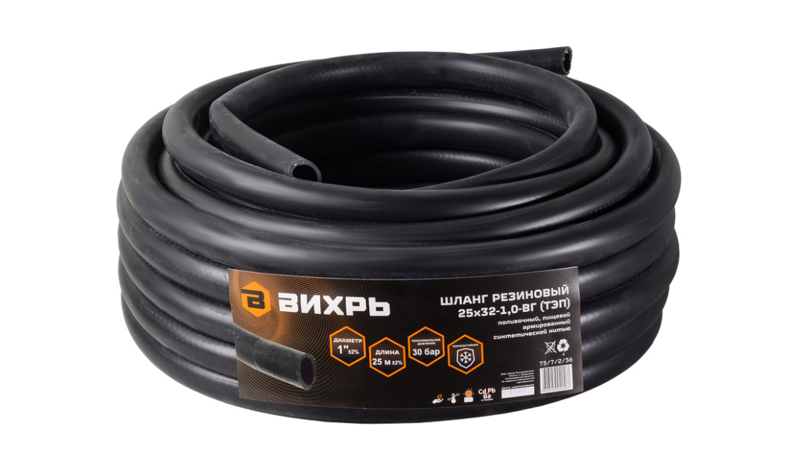 Шланг резиновый армированный - это надежный и прочный шланг, который идеально подходит для различных задач по перекачиванию воды. Его особенностью является высокая степень гибкости и прочности, благодаря использованию специального материала - термоэластопласта (ТЭП). Может использоваться для питьевой воды, не содержит в составе кадмия, бария и свинца. Устойчив к УФ-излучению и химическим реагентам, не подвержен гниению. Трехслойный шланг армирован синтетической нитью, не перегибается и не образует заломов. Выдерживает высокого давление в системе: до 30 бар. Шланг Вихрь ТЭП отличается высокой степенью износостойкости и устойчивостью к перепадам температур. Не дубеет на морозе, рабочий диапазон от -50 до +90 °С. Этот шланг имеет универсальный диаметр 1",что обеспечивает удобство в использовании и позволяет подключить его к различным насосам и другому оборудованию. Благодаря длине в 25 метров, он обеспечивает удобство в использовании и позволяет оперировать с жидкостями на значительном расстоянии от источник.