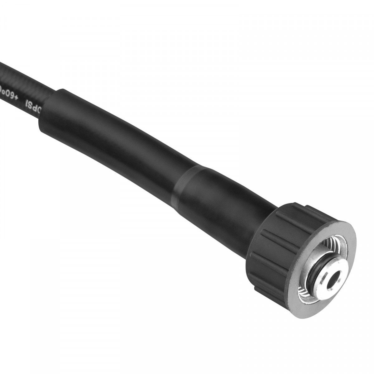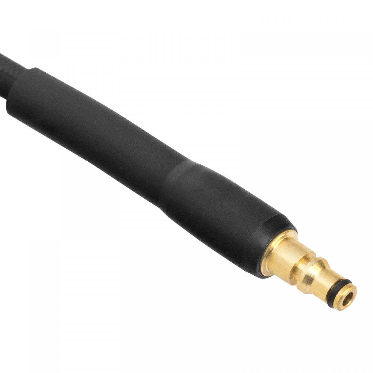 - Прочность — шланг из высококачественной резины в текстильной оплетке выдерживает давление до 16 МПа, а пластиковая окантовка на концах снижает риск появления заломов и трещин.