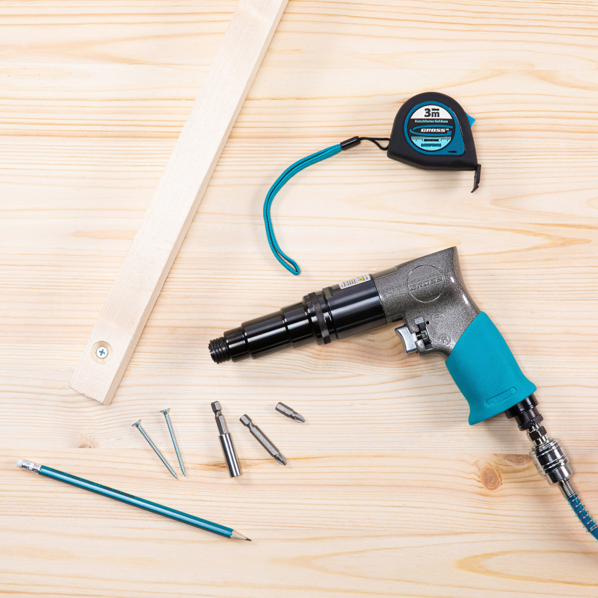 • Быстросъемное соединение — шуруповерт легко подключается к компрессору, что экономит время мастера.