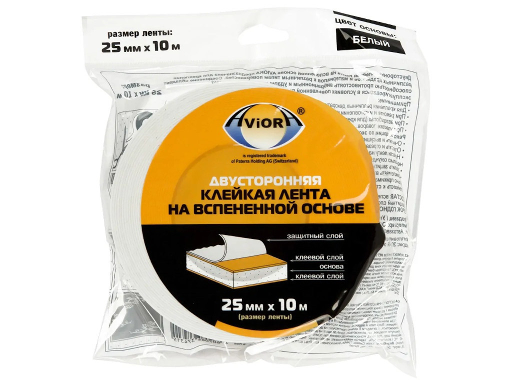 Скотч двухсторонний AVIORA на вспененной основе 25мм*10м, белая