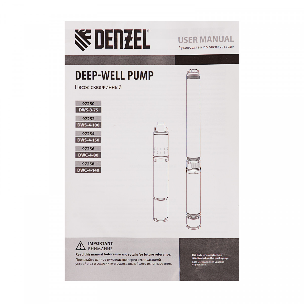 Скважинный насос DWS-3-75, винтовой, диаметр 3", 500 Вт, 1600 л/ч, напор 75 м Denzel