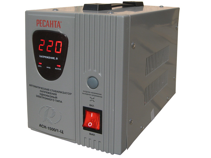Стабилизатор напряжения АСН-1500/1-Ц "Ресанта" предназначен для обеспечения качественного электропитания и долгой работы различных бытовых устройств в условиях нестабильного напряжения в сети. Данный стабилизатор может обеспечивать стабильным питанием, таких потребилей как - холодильник, кофеварка, компьютер. Принцип работы. Регулировка напряжения происходит за счет переключения обмоток на трансформаторе при помощи реле. Поэтому данный вид стабилизаторов называется "релейный". Осуществляется ступенчатая регулировка. При ступенчатой регулировке точность выходного напряжения возрастает до 8%, т.е. 17,6В, что вполне допустимо для всех бытовых приборов. Но за счет этого сокращается время регулировки, оно минимально и составляет 20-35 мсек, т.е. менее 1 секунды! Такой стабилизатор стоит устанавливать в места где входное напряжение постоянно изменяется.