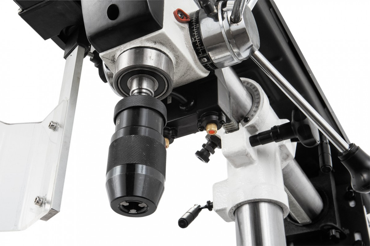 Наклон сверлильной головки аппарата регулируется. Станок производит сверление под углом до 45о влево и под углом до 90о вправо. В зависимости от плотности обрабатываемого материала регулируется скорость вращения шпинделя. Она составляет от 500 до 2500 об/мин (всего 5 позиций). Устанавливать глубину сверления позволяет шпиндель с ходом 80 мм с концевым упором.