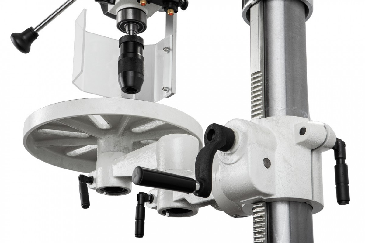 Сверлильный станок JET JDR-34 10000390M предназначен для интенсивного сверления дерева в домашних условиях. Оснастка фиксируется в быстрозажимном патроне. Скорость вращения сверла регулируется. Глубина обработки устанавливается пользователем. Ход шпинделя 80 м, вылет – до 410 мм. Сверлильная головка меняет угол наклона: до 45о вправо и до 90о влево. Линия реза подсвечивается световым указателем.