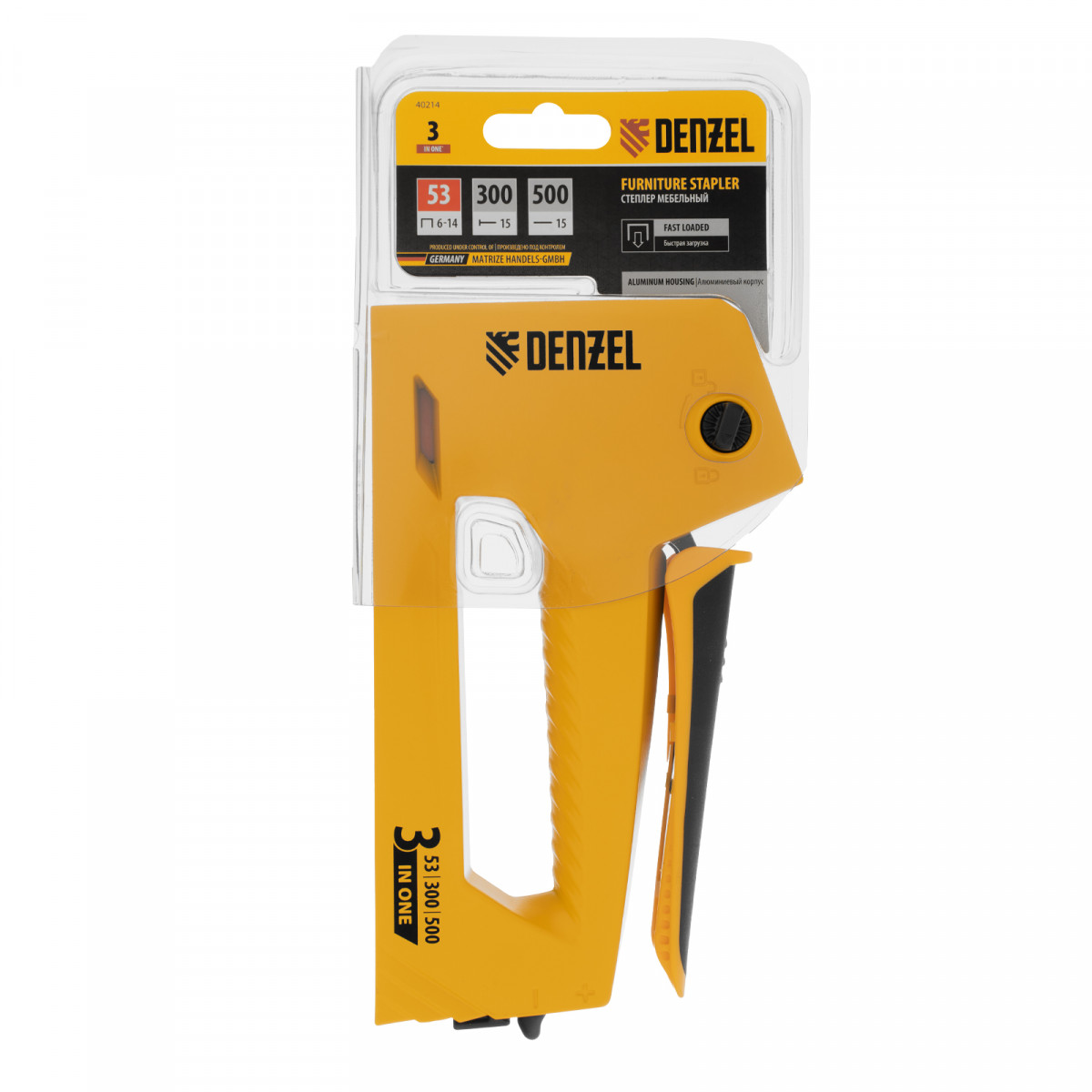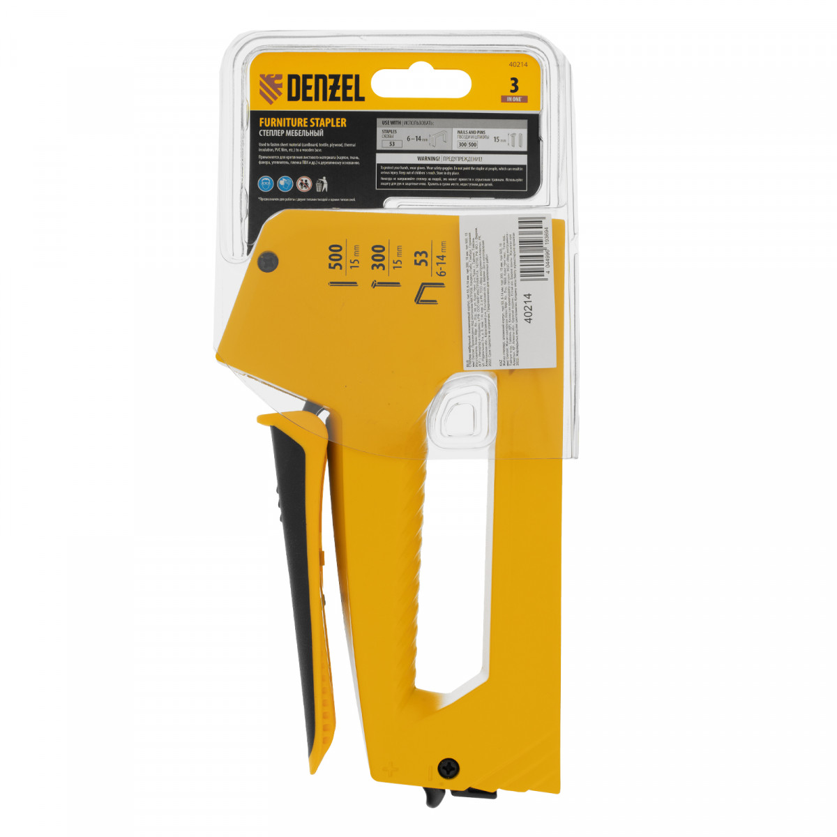 Мебельный степлер Denzel 40214 в алюминиевом корпусе работает со скобами типа 53 размером 6-14 мм, а также гвоздями 300 и штифтами 500 длиной 15 мм. Используется для скрепления листовых материалов: фанеры, ДВП, ДСП, оргалита, а также для фиксации пленки и теплоизоляционного материала на деревянном основании. Эффективный ударный механизм позволяет на 30% снизить нагрузку на руку. Инструмент пригодится для обивки мебели, укладки напольных покрытий, выполнения ремонтных и багетных работ.