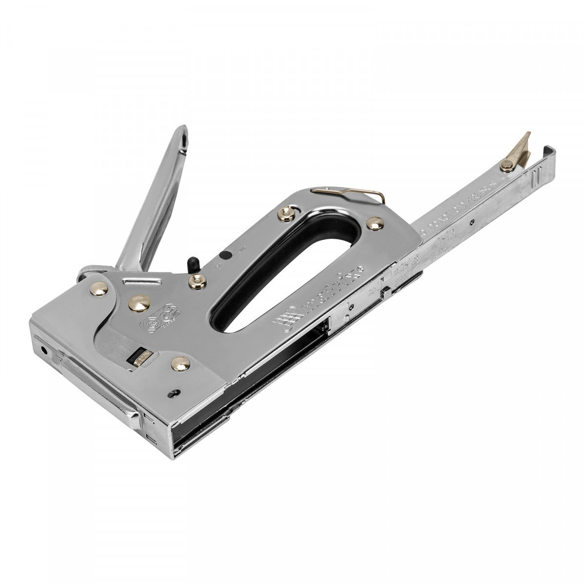 - Безопасное хранение и транспортировка — скоба-фиксатор удерживает рукоятку в нерабочем положении, исключая случайное срабатывание степлера.