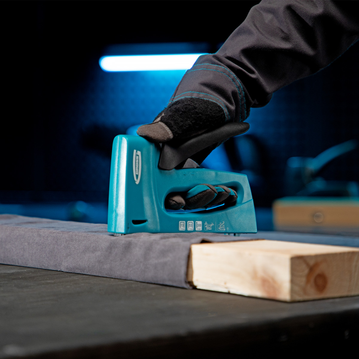 Мебельный степлер Gross 41003 в пластиковом корпусе, с функцией регулировки силы удара, совместим со скобами типа 13, 53 размером 6-16 мм и гвоздями типа 300 размером 16 мм. Его используют для быстрого крепления на деревянном основании фанеры, оргалита, ДВП, ДСП, пленки, утеплителя и других листовых материалов. Корпус устойчив к повреждениям, поскольку отлит из ударопрочного пластика. Двухпозиционный переключатель позволяет регулировать силу удара в зависимости от длины скоб и твердости материала. Действия в труднодоступных местах облегчает длинный тонкий носик. Инструмент идеально сбалансирован, что сводит отдачу к минимуму. Степлер пригодится при сборке и обшивке мебели, укладке ковровых покрытий и изоляционных материалов, выполнении багетных работ. Подходит для профессионального применения.