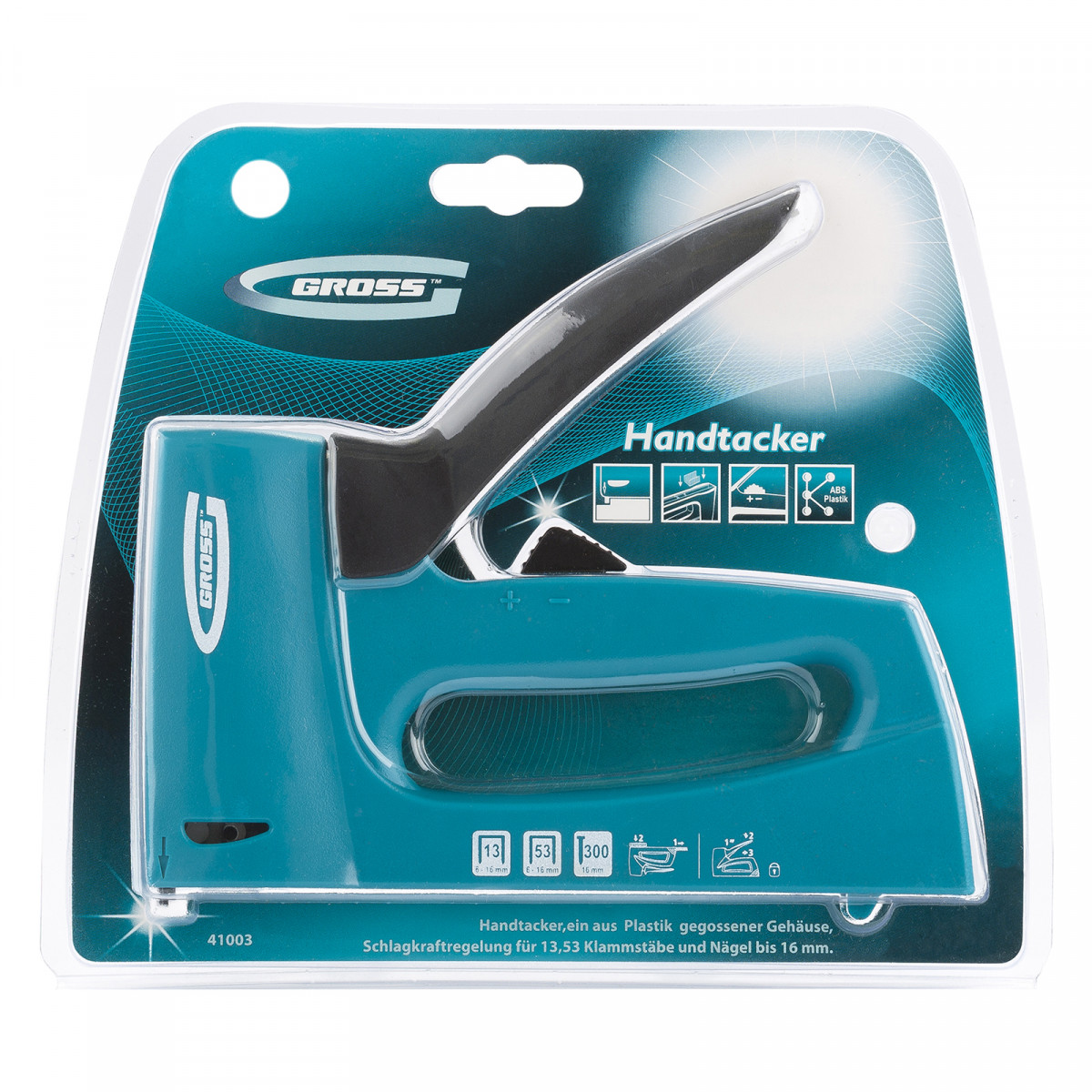 Степлер мебельный, пластиковый корпус, регулировка удара, тип скобы: 13, 53, 300, 6-16 мм Gross