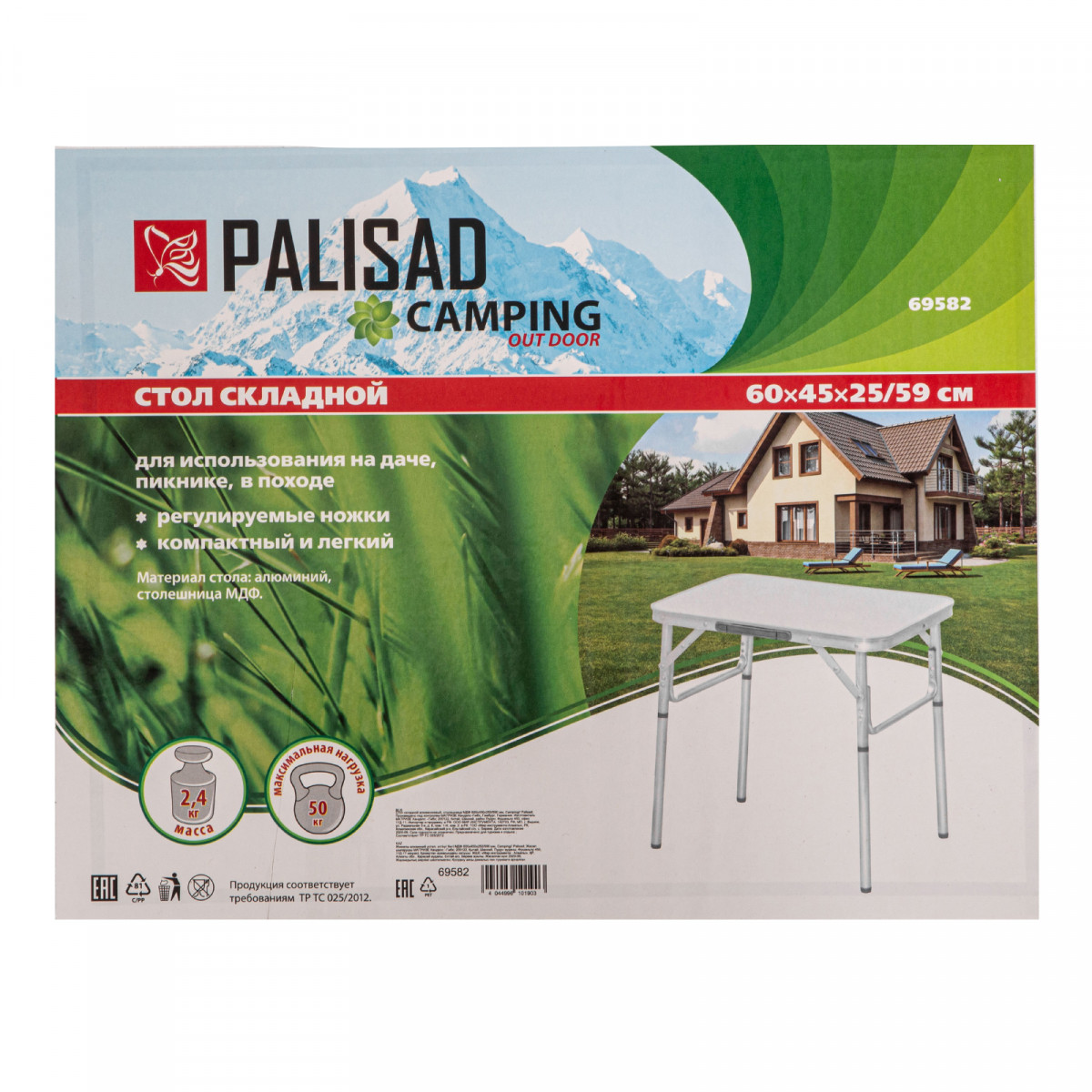Складной стол Palisad Camping 69582 размером 600 х 450 х 250 / 590 мм, со столешницей из МДФ, позволяет организовать прием пищи для нескольких человек. Пригодится во время отдыха на дачном участке, на пикнике, а также послужит дополнительным столом в случае визита гостей. За счет алюминиевых ножек имеет облегченную конструкцию и весит всего 2,52 кг, поэтому удобен в транспортировке. Благодаря составным ножкам стол можно зафиксировать на высоте 25 или 59 см.