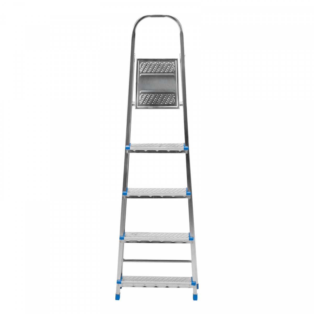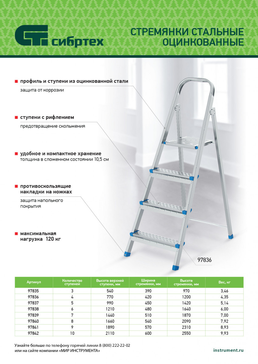 Стальная оцинкованная стремянка Сибртех 97837 с 5 ступенями позволяет повесить полку, картину или шкафчик, достать нужный предмет и решить другие задачи, для которых требуется доступ к предметам на высоте. Рама и ступени из стального профиля выдерживают вес до 120 кг. Расстояние от опорной поверхности до площадки составляет 99 см, при среднем росте пользователя 170 см рабочая высота лестницы — 299 см. Необходимо соблюдать технику безопасности: размещать стремянку только на ровной плоскости и не использовать ее для работы с дрелью, шуруповертом и другим электроинструментом.