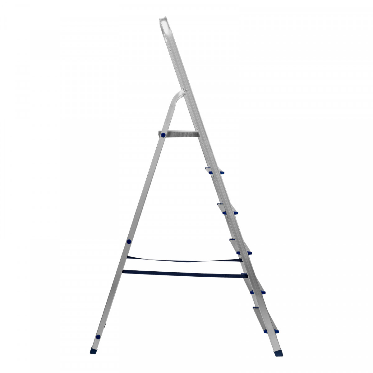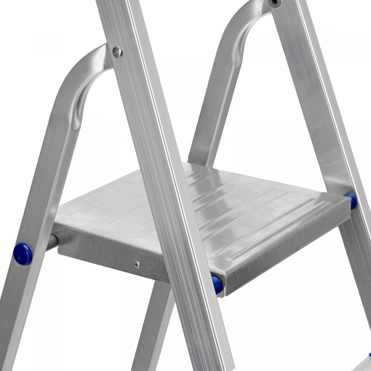 • Надежность — рама из прямоугольного алюминиевого профиля выдерживает нагрузку до 150 кг, широкие ступени закреплены заклепками, страховочные стяжки повышают прочность конструкции.