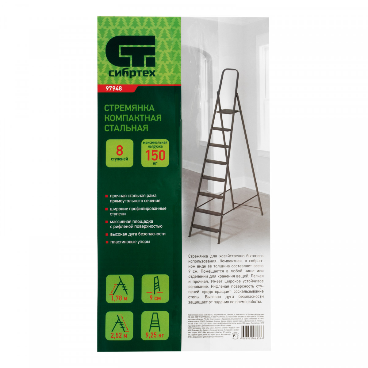 Стремянка компактная стальная Сибртех 97948 с 8 ступенями служит для проведения работ на высоте, превышающей человеческий рост. Стальные профилированные рама и ступени рассчитаны на нагрузку до 150 кг. Площадка находится на высоте 179 см от опорной поверхности, рабочая высота стремянки составляет 379 см (при среднем росте пользователя 170 см). Использовать стремянку можно дома, на даче или в гараже, а также во время строительства и ремонта.