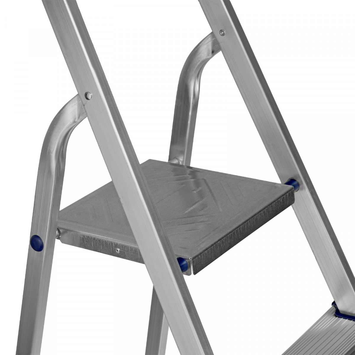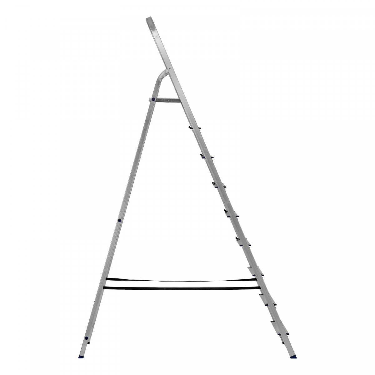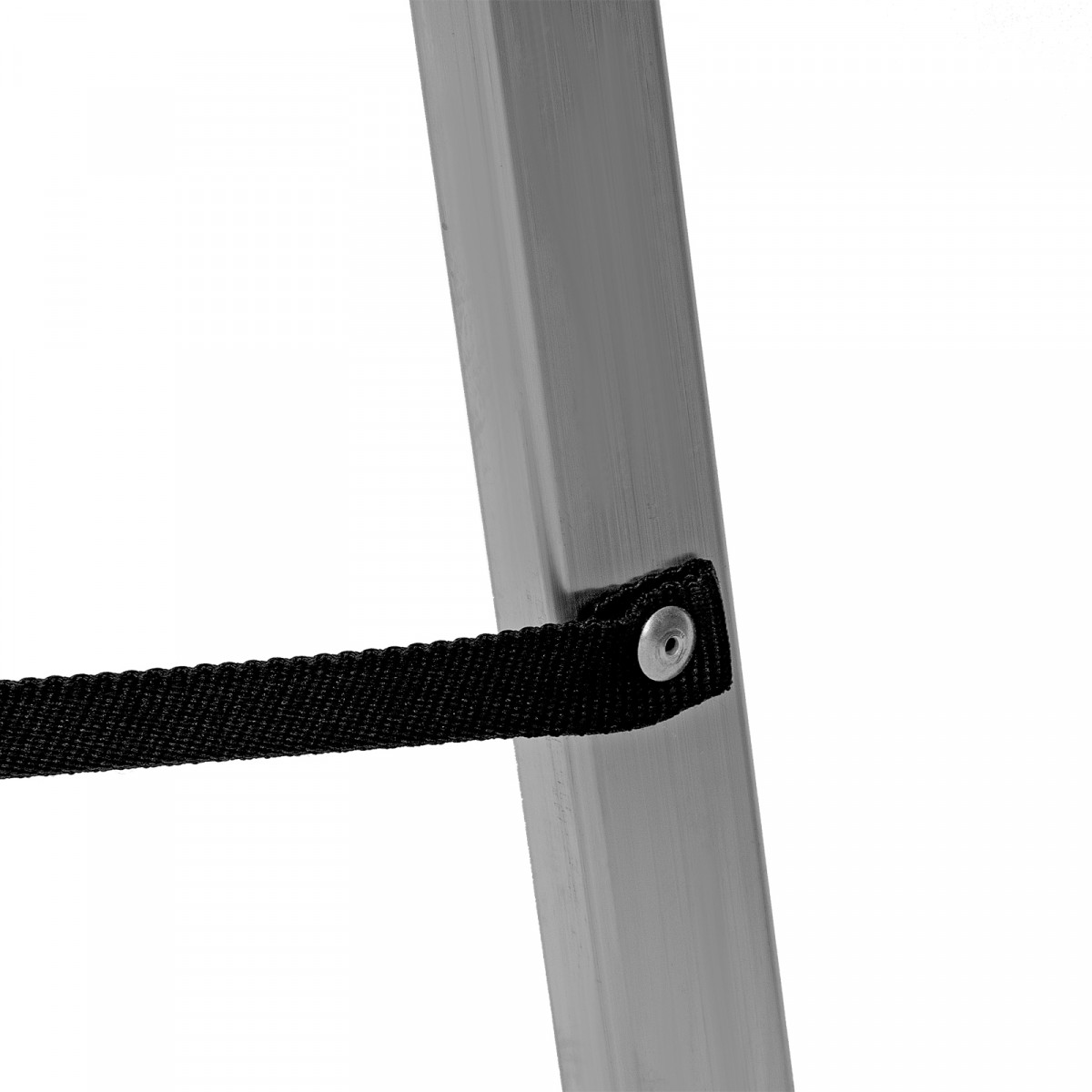 • Надежность — рама из прямоугольного алюминиевого профиля выдерживает нагрузку до 150 кг, широкие ступени закреплены заклепками, страховочные стяжки повышают прочность конструкции.