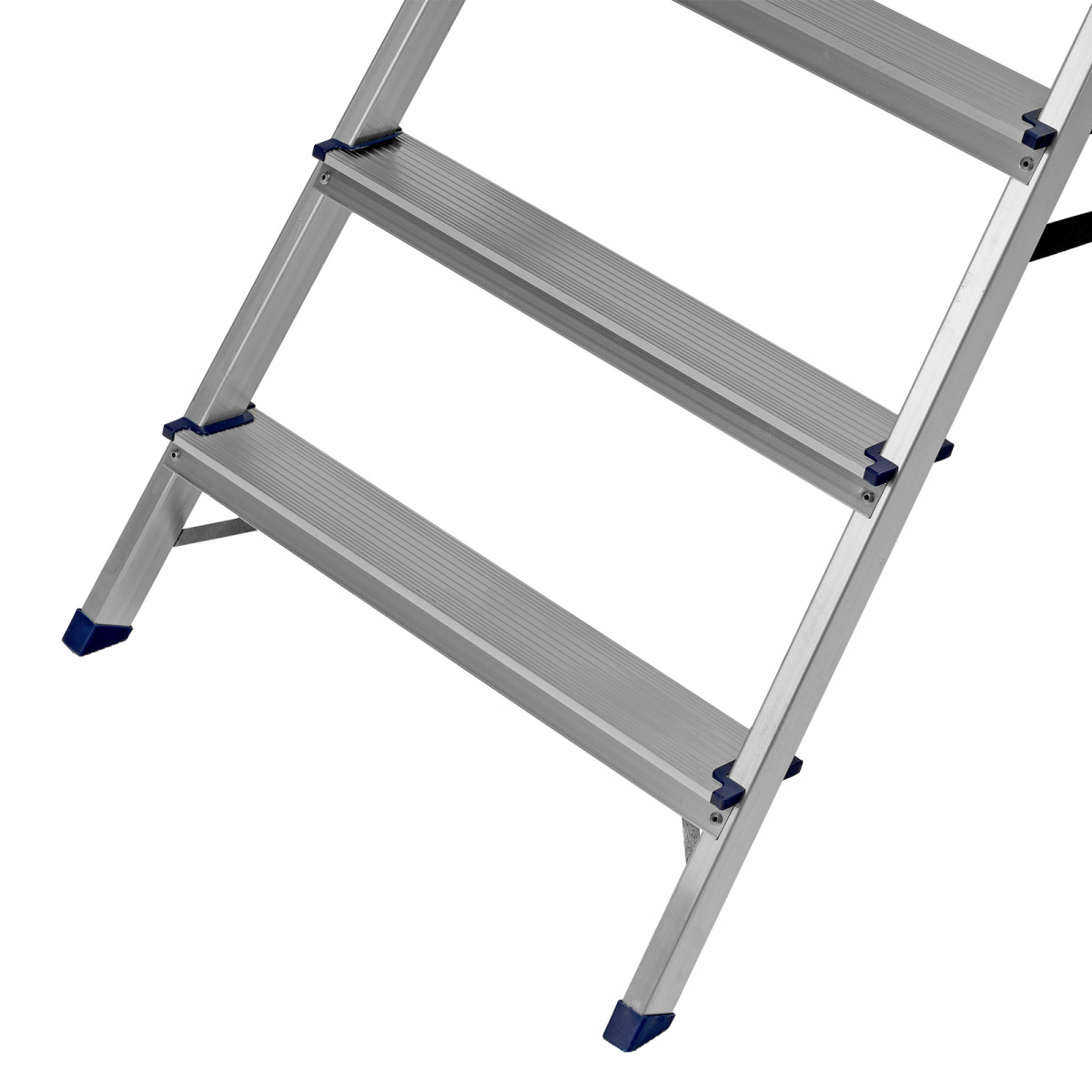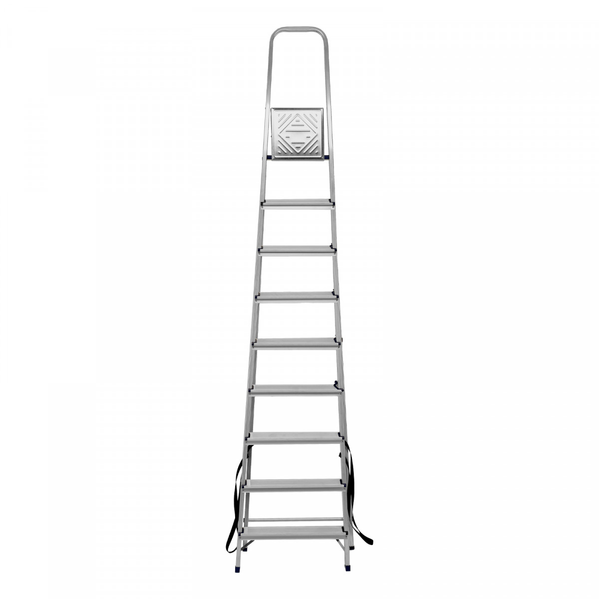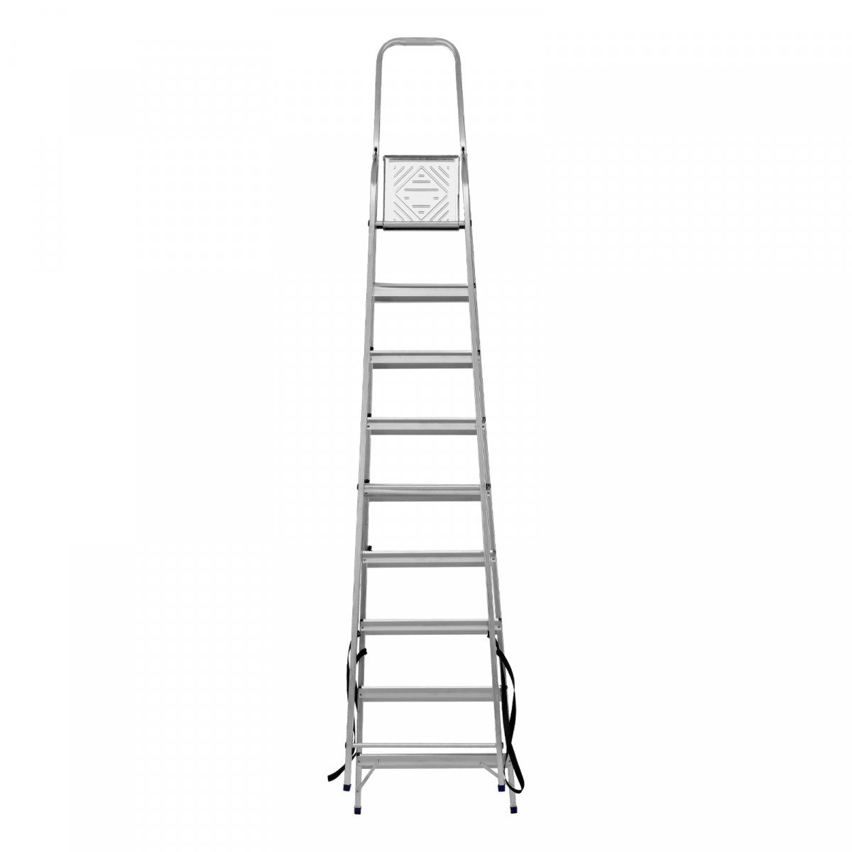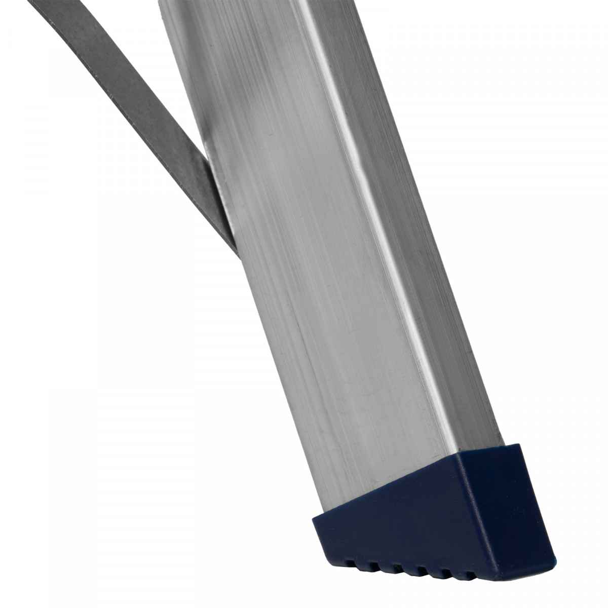 • Надежность — рама из прямоугольного алюминиевого профиля выдерживает нагрузку до 150 кг, широкие ступени закреплены заклепками, страховочные стяжки повышают прочность конструкции.