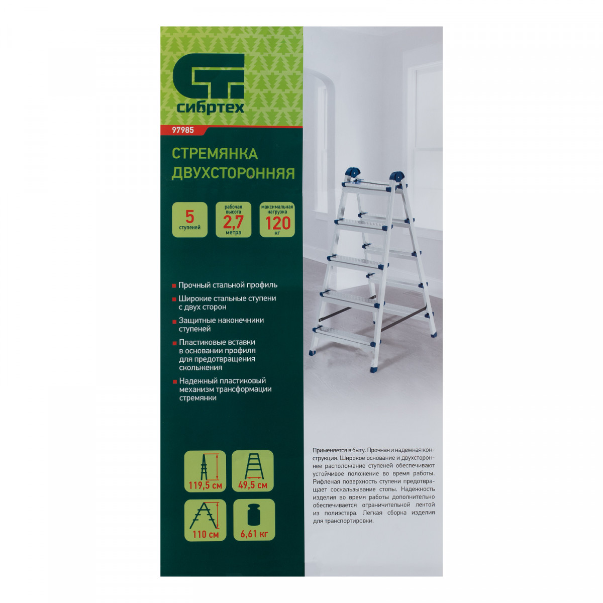 Стремянка двухсторонняя Сибртех 97985 со стальным профилем и 5 стальными ступенями помогает решать бытовые задачи на высоте, превышающей человеческий рост. Ее используют, чтобы доставать предметы с антресолей или шкафов, проводить уборку, менять лампочки, вешать полки или картины. Работать с электроинструментом на ней не рекомендуется. Стремянка с пластиковым складным механизмом повышенной стабильности и широким основанием очень устойчива на ровной поверхности. Площадка находится на высоте 110 см от опорной поверхности, рабочая высота стремянки составляет 310 см (при среднем росте пользователя 170 см).