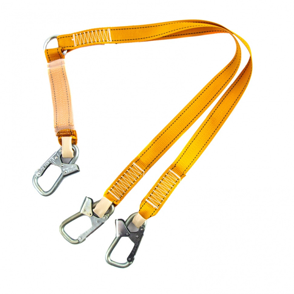 Ленточный двойной строп Сибртех 89511 с амортизатором, нерегулируемая модель «аАД», предназначен для соединения удерживающей (страховочной) привязи с анкерной точкой крепления. Используется совместно с удерживающими (страховочными) привязями, имеет 3 карабина, которые обеспечивают 3 точки крепления: 2 к анкерной точке и одну к поясу работника.