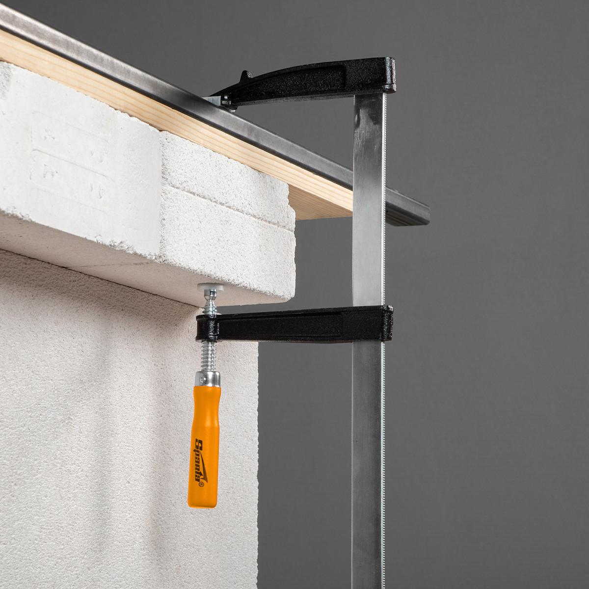 F-образная струбцина Sparta 204415, 500 х 120 х 570 мм, используется в столярном и слесарном деле и позволяет фиксировать заготовки из металла, древесины и других материалов для их соединения или обработки. Деталь помещают между губками, одна из которых подвижна и служит для регулировки величины захвата. Винтовой зажим позволяет прикладывать значительное усилие для надежной фиксации. Защитные накладки предотвращают повреждение детали. Элементы конструкции выдерживают высокую температуру, поэтому струбцина подходит для проведения сварочных работ, при этом пластиковые накладки необходимо снять.