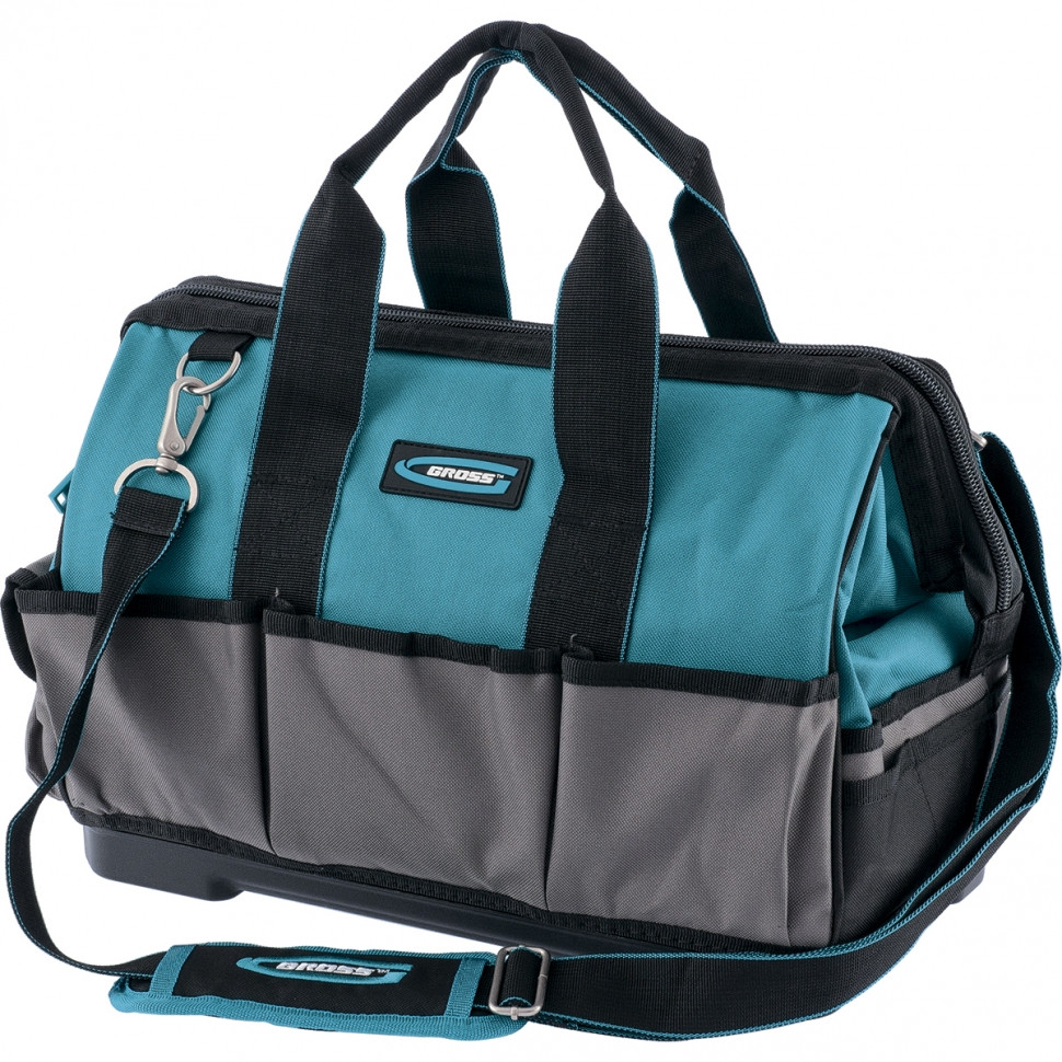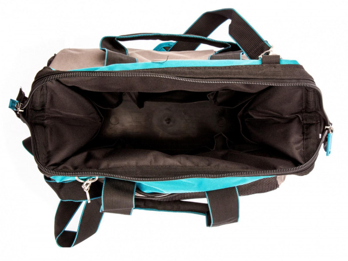 Сумка для инструмента предназначена для переноса и хранения ручного инструмента. Сумка оснащена двумя ручками, а также съемным наплечным ремнем на усиленных карабинах. Жесткое пластиковое дно устойчиво к внешним ударным воздействиям. 26 карманов (8 внутренних + 18 внешних). Размеры пластикового дна: 400 х 225 мм.