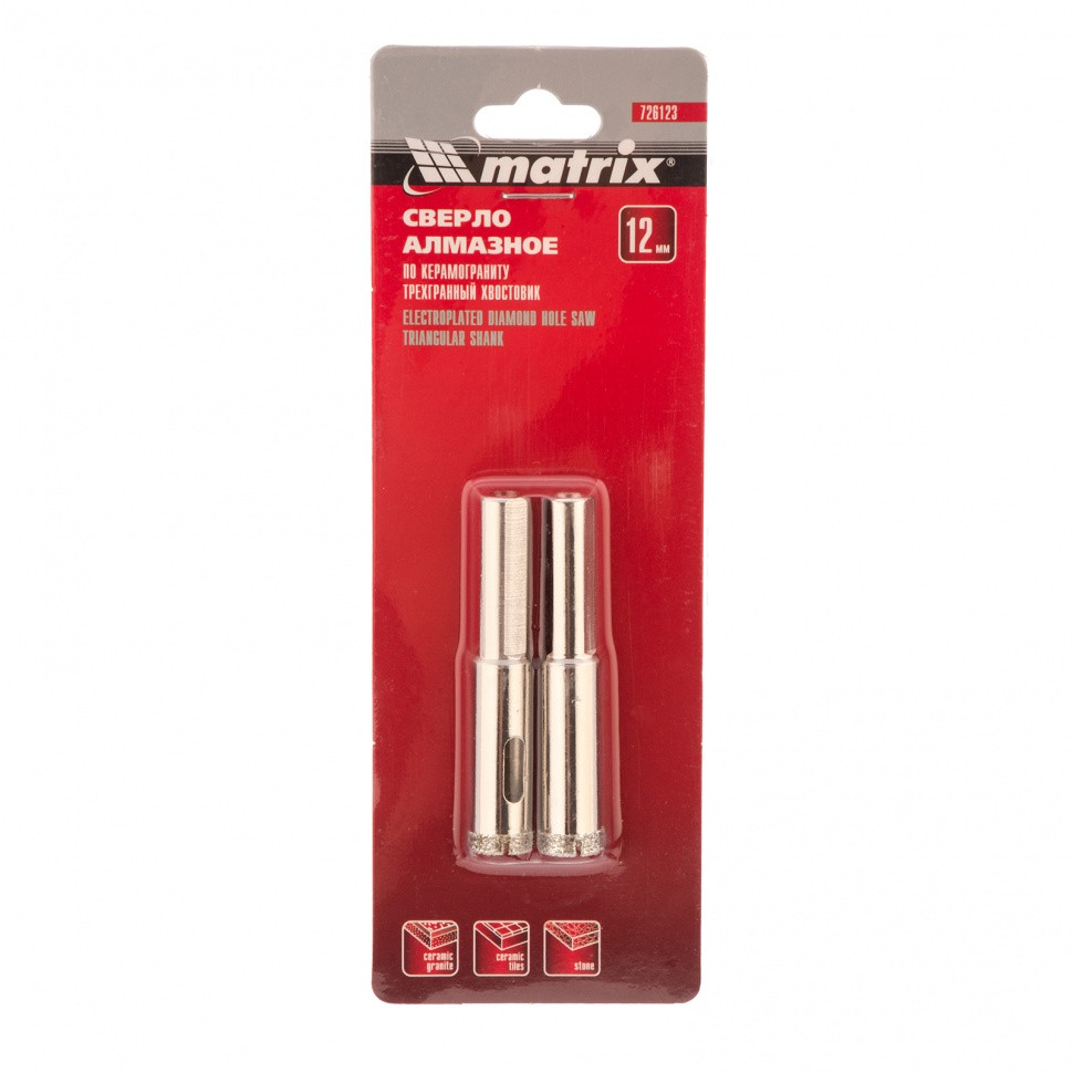 Сверло алмазное по керамограниту, 12 х 67 мм, трехгранный хвостовик, 2 шт Matrix