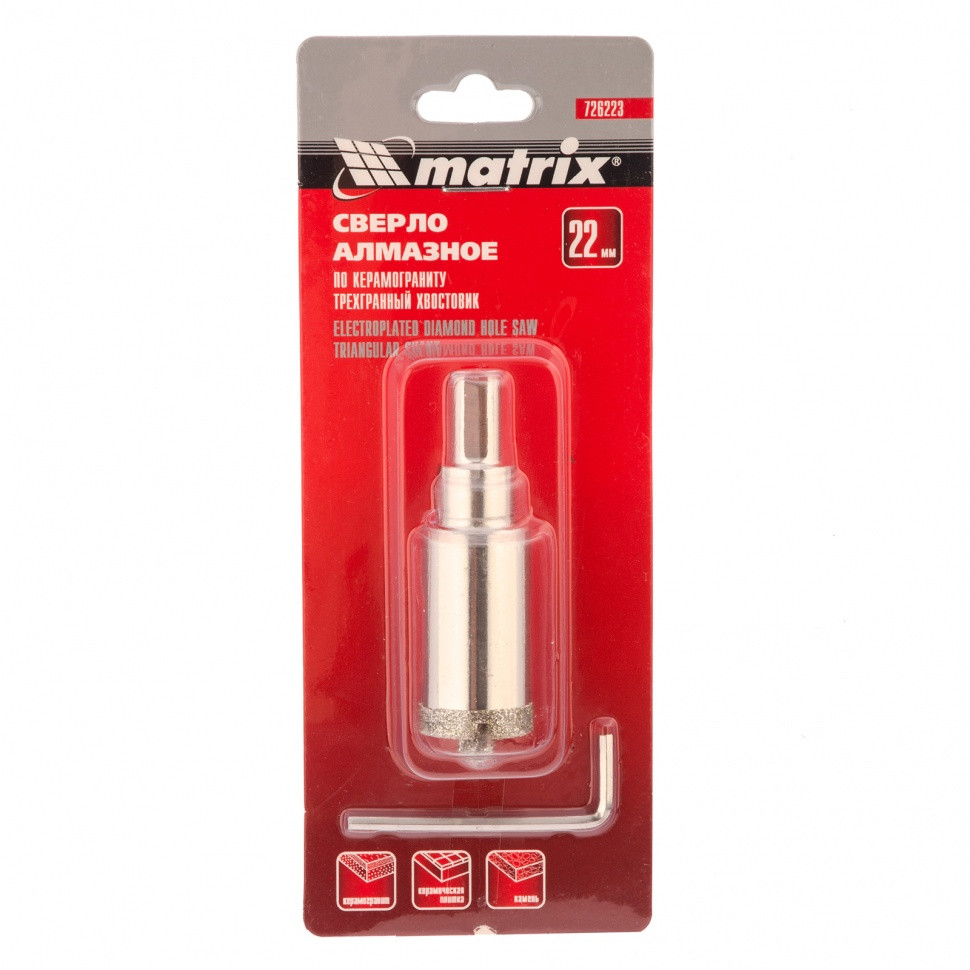 Сверло алмазное по керамограниту, 22 х 67 мм, трехгранный хвостовик Matrix