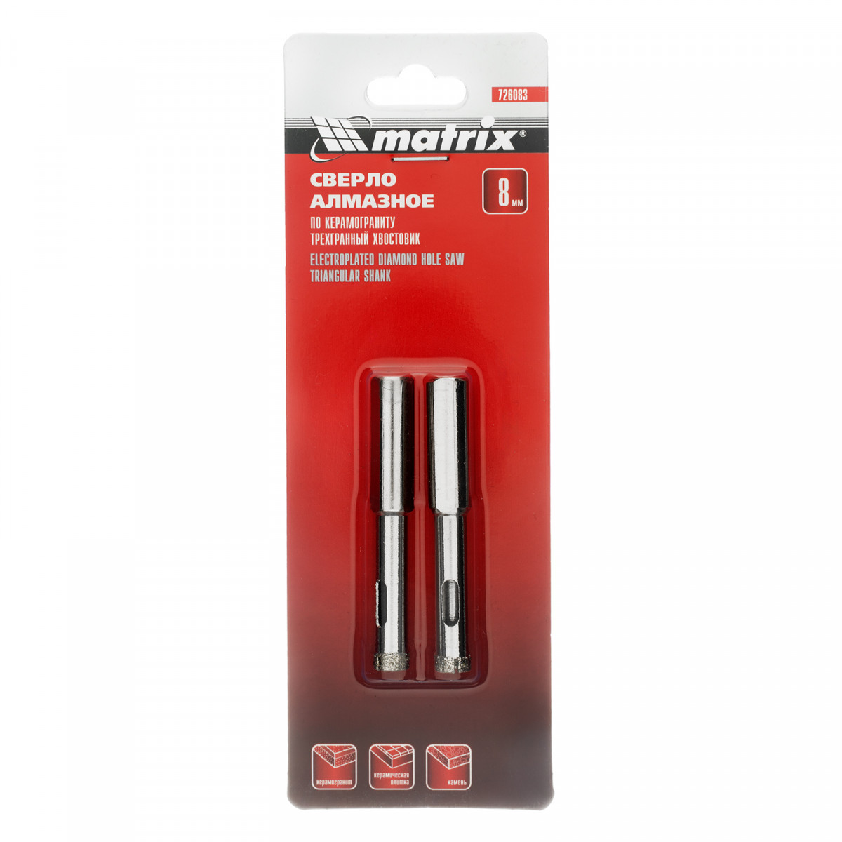 Сверло алмазное по керамограниту, 8 х 67 мм, трехгранный хвостовик, 2 шт Matrix
