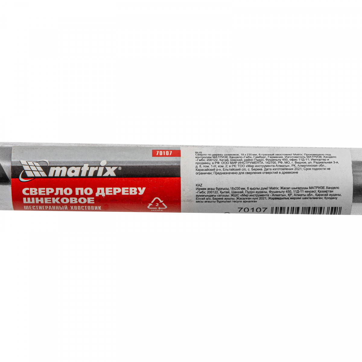 Сверло по дереву шнековое, 18 х 230 мм, шестигранный хвостовик Matrix
