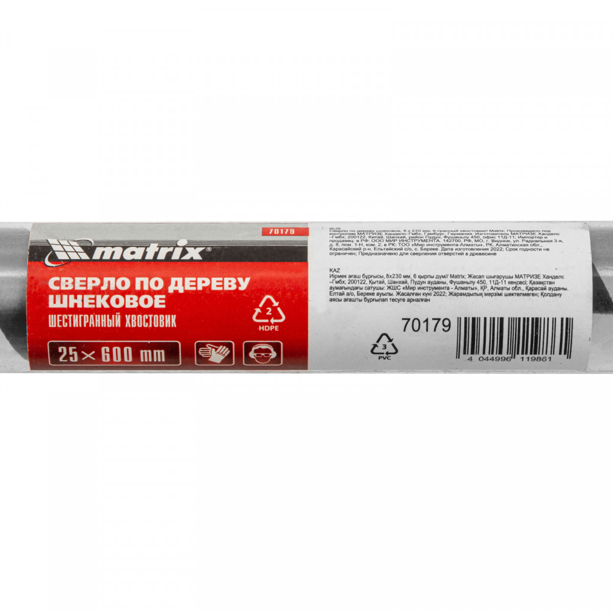 Сверло по дереву шнековое, 25 х 600 мм, шестигранный хвостовик Matrix