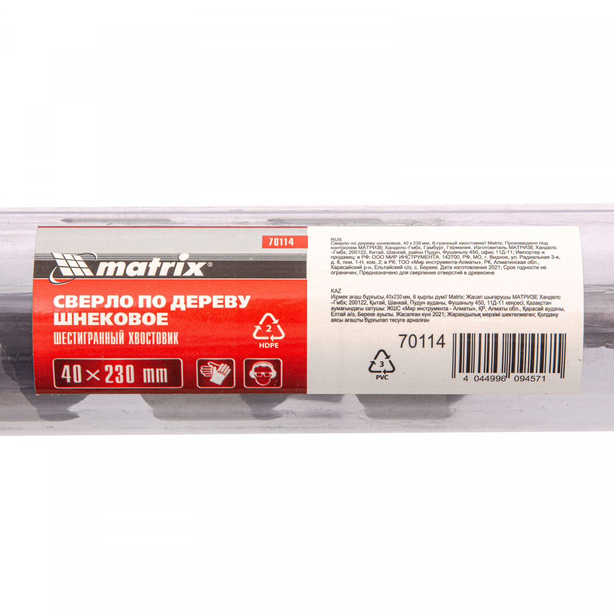 Сверло по дереву шнековое, 40 х 230 мм, шестигранный хвостовик Matrix