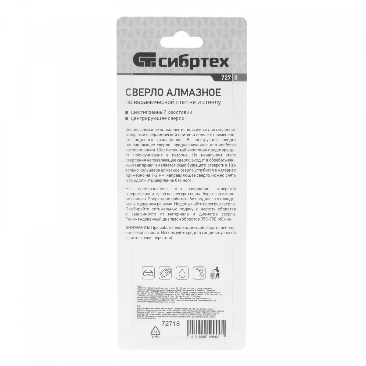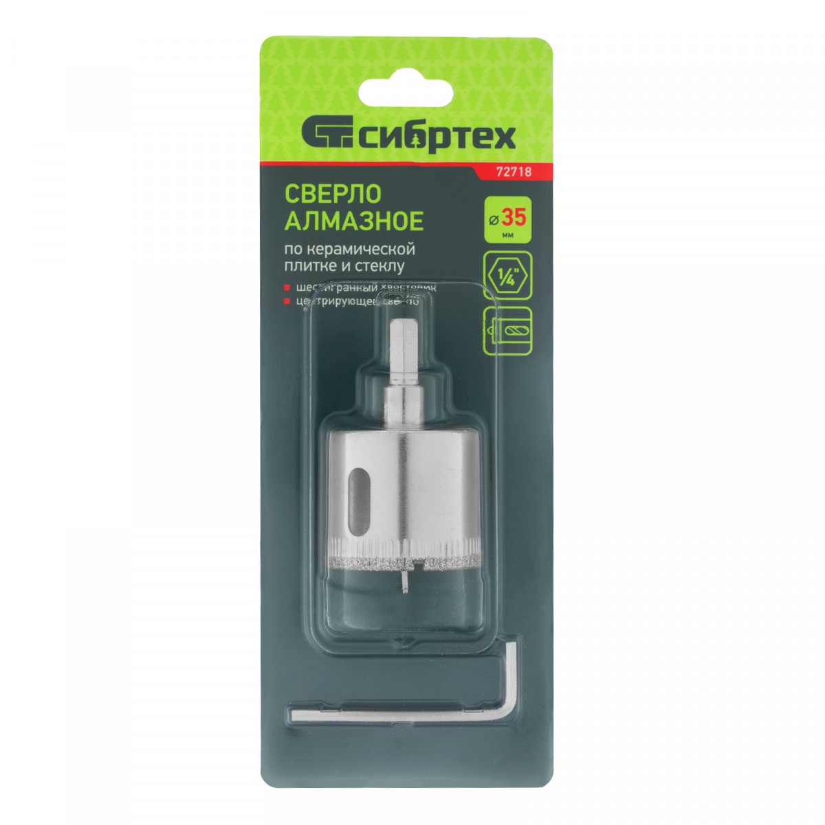 Сверло Сибртех 72718 размером 35 х 55 м, с шестигранным хвостовиком и центрирующим сверлом, позволяет получать отверстия в керамической плитке и стекле. Его устанавливают на дрель или шуруповерт, рекомендуемый диапазон рабочих оборотов 350-700 об/мин. Оснастка используется при выполнении бытовых ремонтных и отделочных работ.