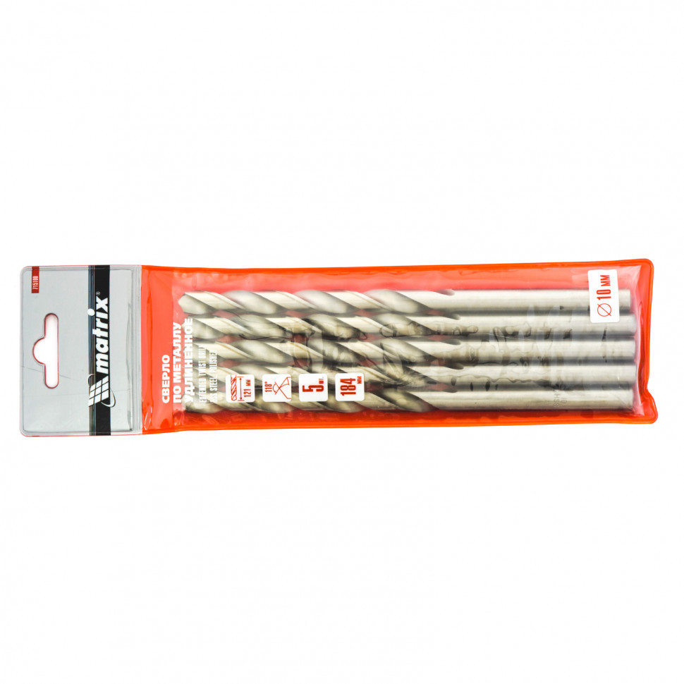 Сверло по металлу, 10 х 184 мм, полированное, удл, HSS, 5 шт, цилиндрический хвостовик Matrix