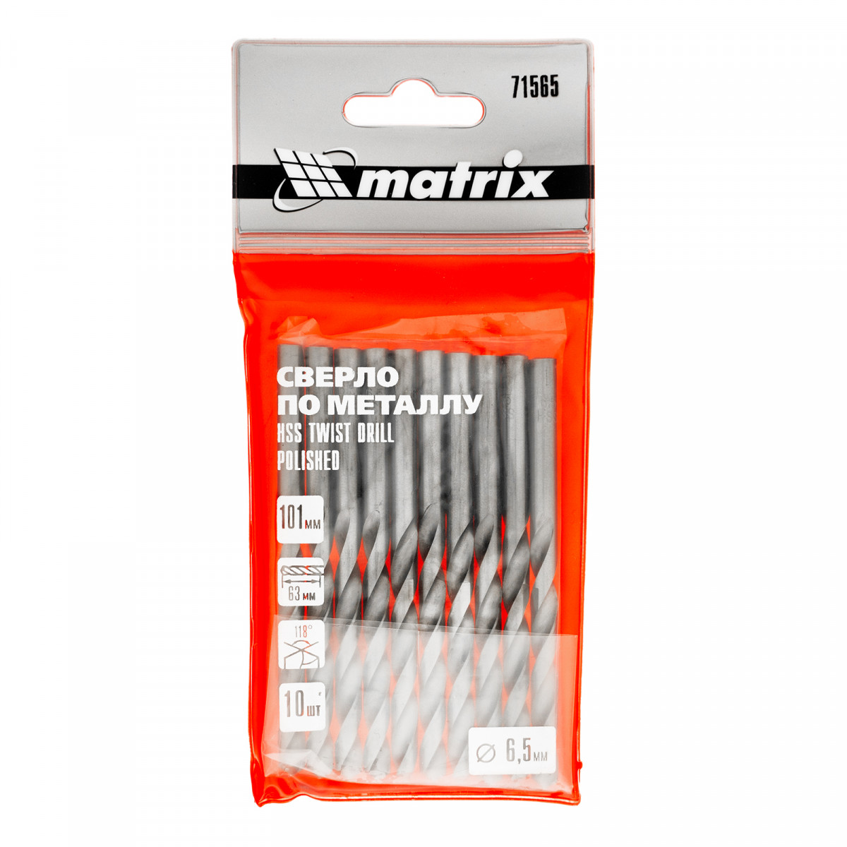 Полированное сверло по металлу Matrix 71565 из стали HSS, с цилиндрическим хвостовиком, 10 шт. в упаковке, используется для получения отверстий диаметром 6,5 мм. Угол заточки составляет 118 градусов, поэтому сверло оптимально для работы с черными металлами, сталью, чугуном и твердой бронзой.