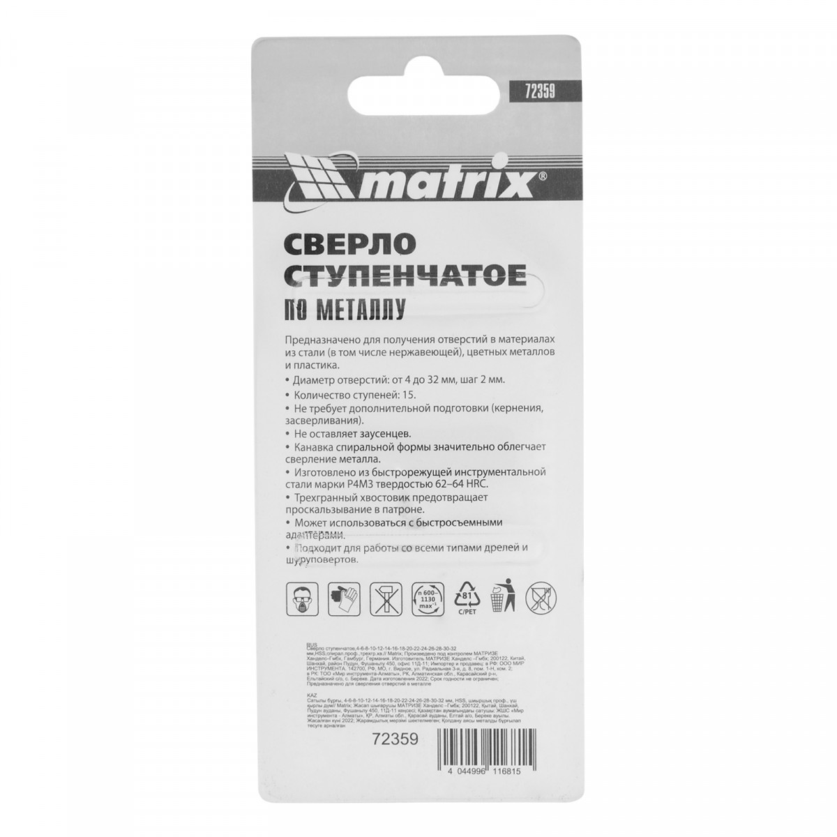 Ступенчатое сверло Matrix 72359 из стали HSS, со спиральным профилем и трехгранным хвостовиком, позволяет получать отверстия диаметром 4-6-8-10-12-14-16-18-20-22-24-26-28-30-32 мм в материалах толщиной до 5 мм: стали, цветных металлах, нержавейке и пластике. Благодаря плавному ступенчатому переходу и возможности сразу снять фаску отверстие получается аккуратным и имеет ровные края.