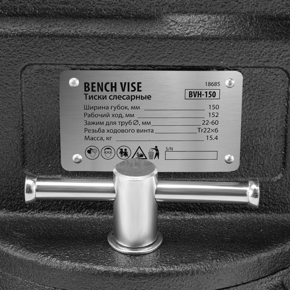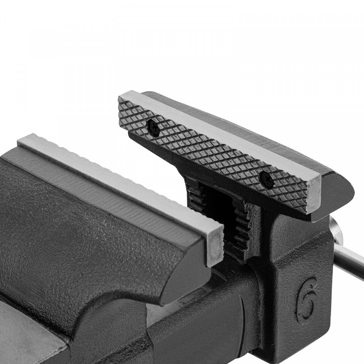 Слесарные поворотные тиски Denzel BVH-150 18685 с губками шириной 150 мм и стальной направляющей предназначены для фиксации деталей и заготовок, а также для выполнения мелких ударных работ — в конструкции предусмотрена наковальня. Рабочий ход составляет 150 мм, глубина зажима — 85 мм. Специальный зажим позволяет фиксировать трубы диаметром 22-60 мм, что расширяет возможности использования инструмента. На губки можно установить защитные накладки (приобретаются отдельно) для предотвращения повреждения зажимаемых предметов. Тиски пригодятся в мастерской и гараже.