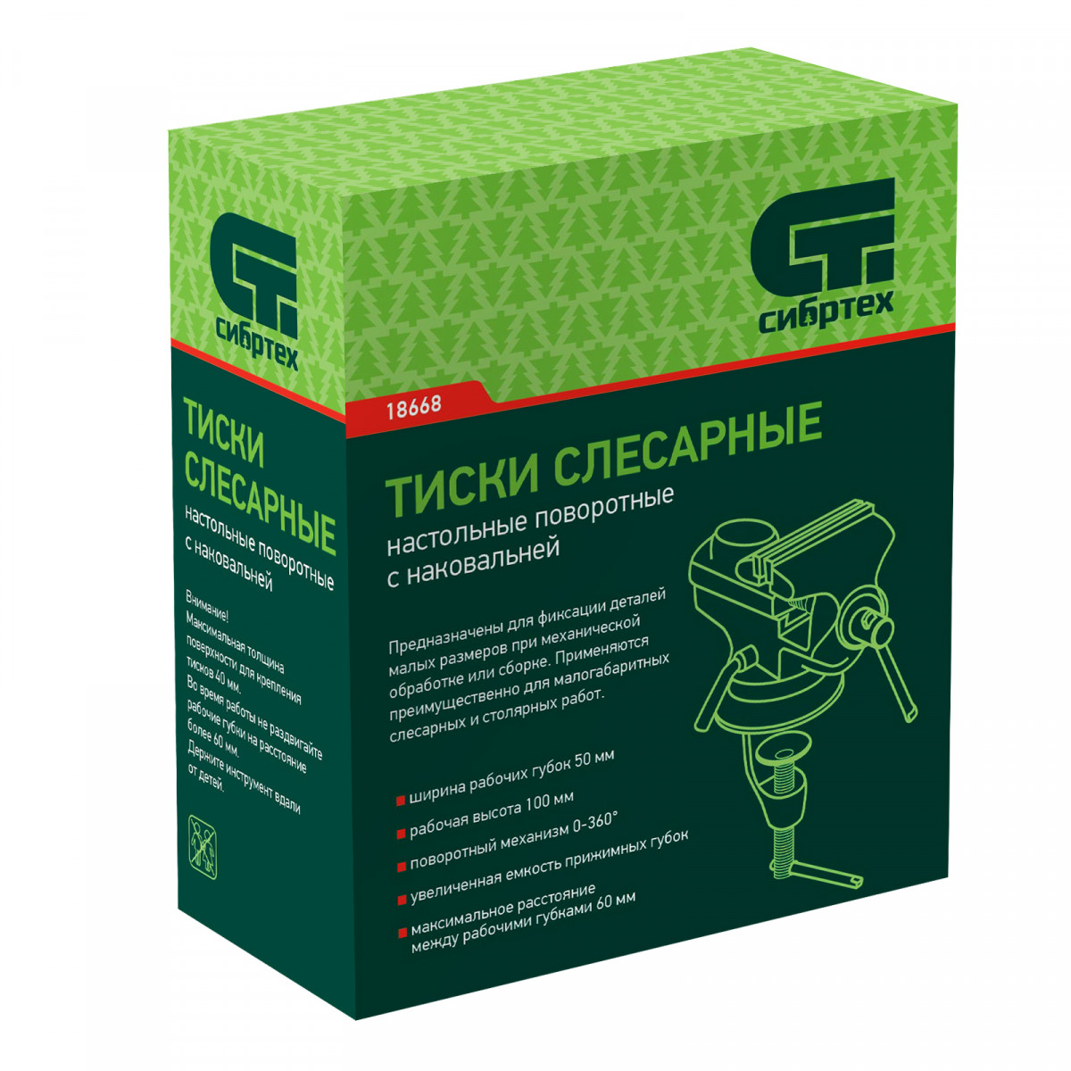Настольные слесарные тиски Сибртех 18668, поворотные, с шириной рабочих губок 50 мм, с наковальней, пригодятся для фиксации заготовок до 55 мм. Благодаря им удобно обрабатывать негабаритные детали. Инструмент пригодится для проведения полупрофессиональных слесарных и столярных работ.