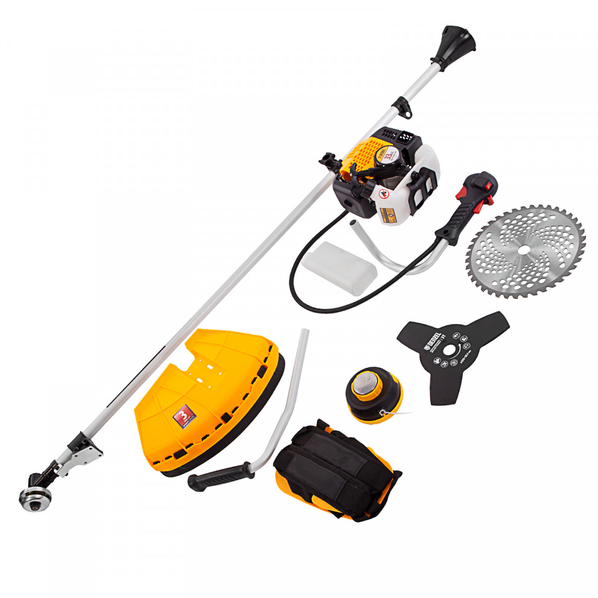 Триммер бензиновый - 1 штКатушка - 1 штНож трехлопастной 3Т - 1 штПильный диск 40Т - 1 штДвухплечевая подвесная система с защитой бедра - 1 штДозатор для приготовления смеси - 1 штНабор крепежа - 1 штНабор инструментов - 1 штРуководство по эксплуатации с гарантийным талоном - 1 штДозатор для приготовления топливной смеси - 1 штЛеска диаметром 2 мм - 1 шт